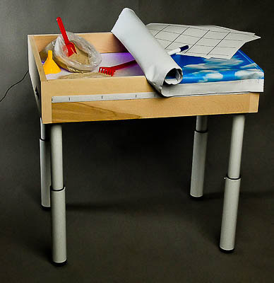 Экологически чистый настольный световой модуль изготовлен из бука. Наличие съемных регулируемых ножек позволяет использовать модуль как на столе, так и на полу. Подсветка через молочное акриловое дно модуля делает работу с набором интересной и увлекательной. На боковой стенке имеются кнопки трех цветов (красного, синего, зеленого). Нажатие трех кнопок одновременно дает белый цвет подсветки; сочетание красной и синей – сиреневый цвет, красной и зеленой – желтый, зеленой и синей – голубой. Цветовые возможности модуля позволяют использовать его в процессе реализации различных видов деятельности детей.