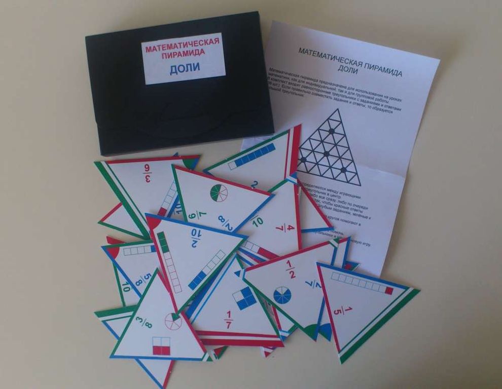 Математическая пирамида предназначена для использования на уроках математики как для индивидуальной, так и для групповой работы. В комплект входят равносторонние треугольники с заданиями и ответами (25 шт.). Если правильно совместить задания и ответы, то образуется большой треугольник.