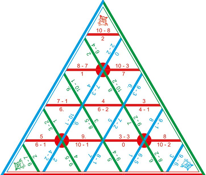 3. В зависимости от договоренности, либо все сразу, либо по очереди каждый выкладывает свои треугольники так, чтобы красные ответы прилегали к красным заданиям, голубые к голубым заданиям, зеленые к зеленым.