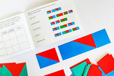 Квадратные карточки обозначают отдельный звук, а прямоугольные – слог. Для обозначения звуков использовано традиционное цветовое кодирование (гласный звук обозначается красным цветом, твердый согласный – синим, мягкий согласный – зеленым).