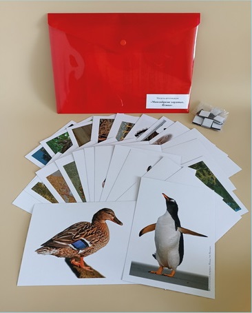 Пособие состоит из 24 карточки, напечатанных на картоне и ламинированных матовой (антибликовой) пленкой. С помощью карточек могут быть продемонстрированы разнообразие видов птиц и их биологические особенности.