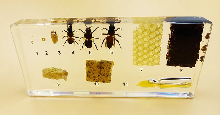 Пособие представляет собой законсервированный в пластмассовом прозрачном блоке методом холодной полимеризации препарат пчелы, ее различные стадии развития, которые обозначены цифровыми метками. Прозрачный блок изготовлен методом холодной полимеризации, боковые грани отполированы, что позволяет рассматривать объект под различными углами.