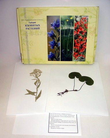 В гербарии представлены 20 наименований наиболее распространенных и известных растений, которые являются ядовитыми и в то же время имеют лекарственное значение. Список растений прилагается. Каждое засушенное растение наклеено на гербарный лист (формат А3), на котором обозначено наименование растения и дано краткое описание. Изделие упаковано в коробку с маркировкой.