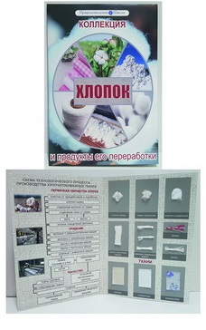 В коллекции представлена технологическая схема производства хлопчатобумажных тканей от сырья до получения готовых изделий и даны основные продукты каждой стадии технологического процесса. На папке расположены рисунки ветки хлопчатника с цветами и плодами и коробочки с волокнами. Коллекцию можно использовать для оформления кабинетов, а также для проведения контрольных опросов и самостоятельных работ. Коллекция в виде папки (в сложенном виде размер 400x280x10мм) упакована в термоусадочную плёнку. На папке печатным способом нанесено: - наименование коллекции; - наименование предприятия- изготовителя и его адрес. Размер упаковки не более 400х280х10мм. Вес не более 0,5кг.