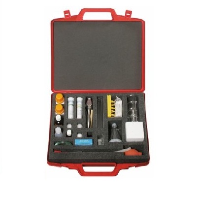 -В комплекте (для 1 рабочей группы или для демонстрации)*: крахмал, гидроксид кальция, глюкоза, хлорид натрия, растительное масло, раствор йода, набор индикаторных полосок для определения белка, набор индикаторных полосок для определения глюкозы, полиэтиленовая бутылка, склянки, пробирки, чеснокодавилка, фильтровальная бумага, шланги, пипетка, нож, термометр, аксессуары.