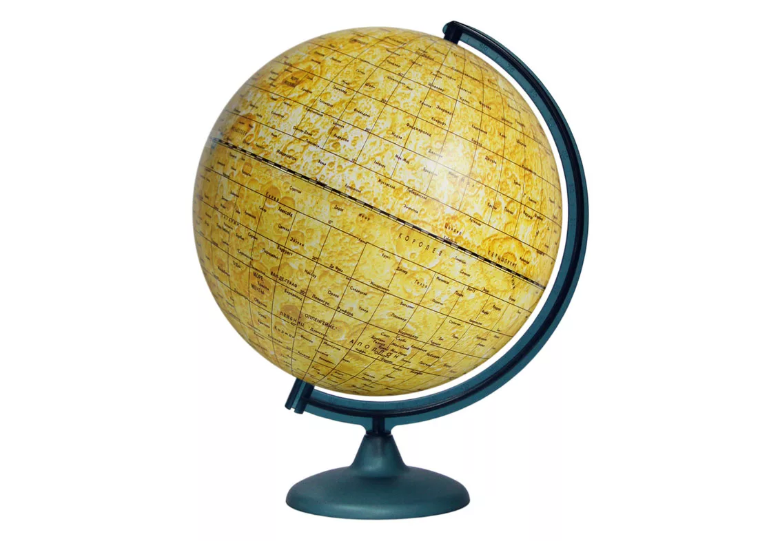 Представляет собой модель Луны с картой поверхности. На глобусе отображены элементы лунного рельефа и их названия на русском языке.