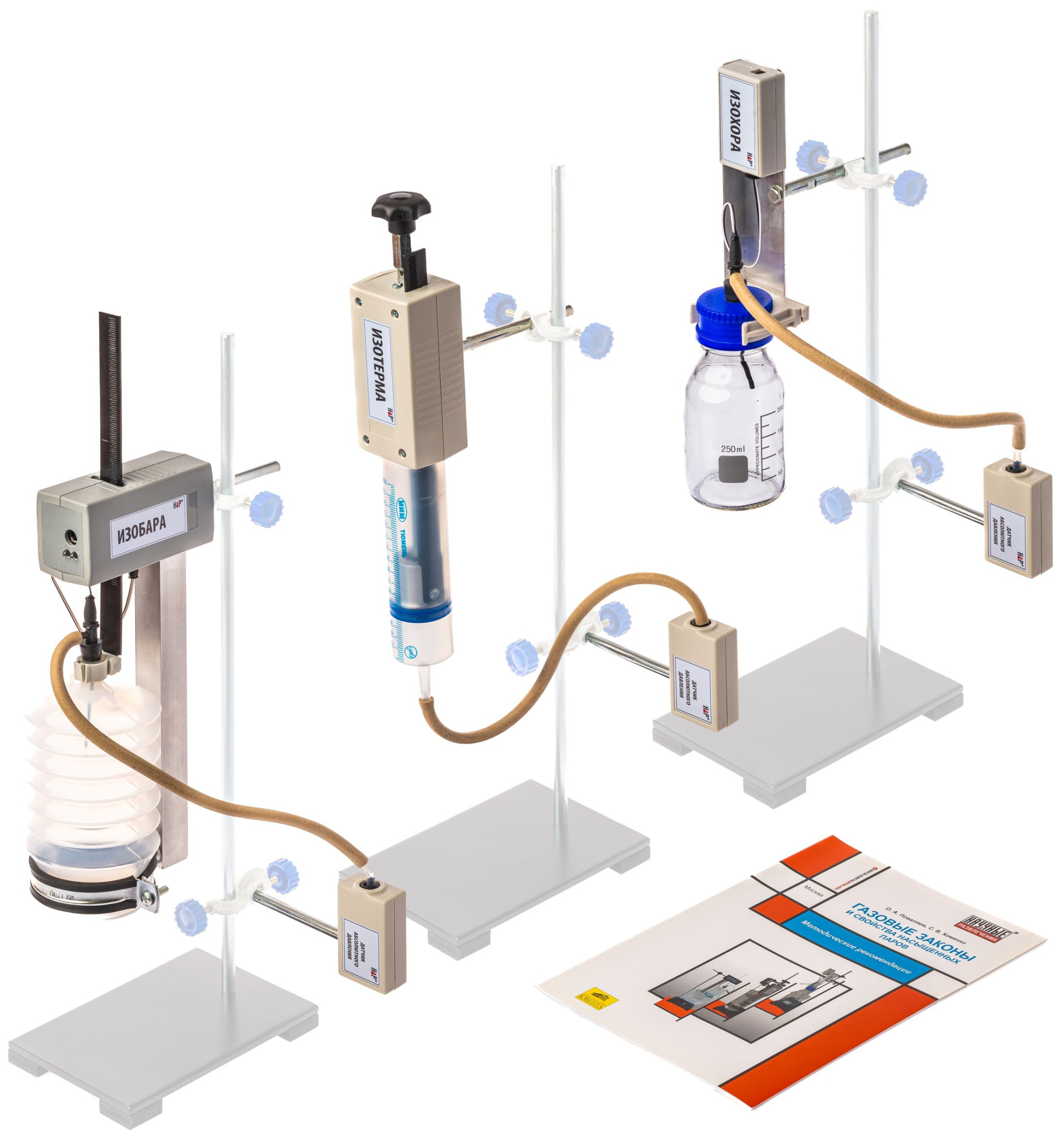 В состав набора входят три установки для осуществления изотермического, изобарного и изохорного процессов, которые имеют встроенные датчики объема и температуры, позволяющие регистрировать параметры газа в процессе изменения его состояния. Конструкция установок обеспечивает постоянство одного из параметров газа при варьировании двух других параметров. Для измерения давления газа применяется датчик абсолютного давления.