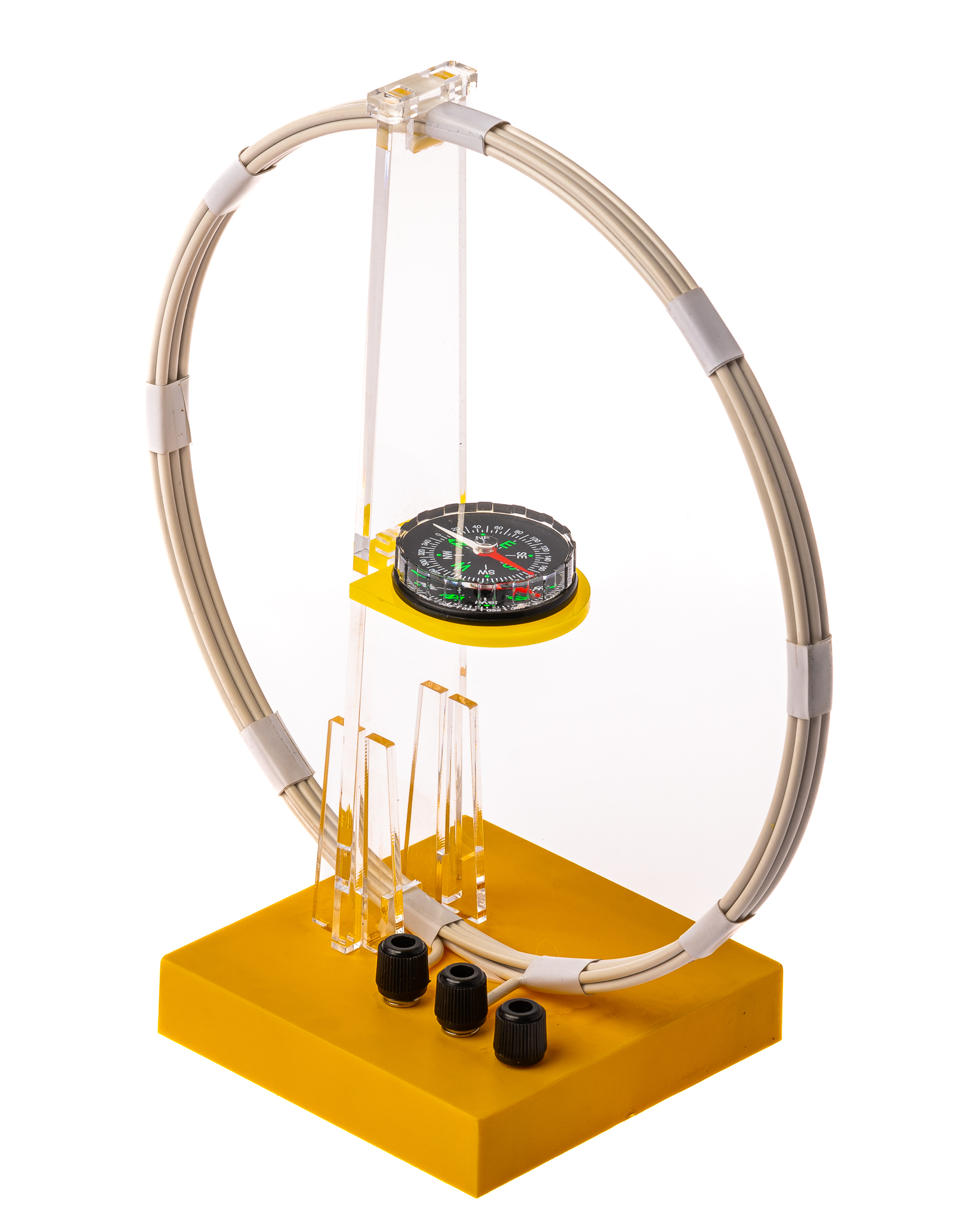 Прибор представляет собой катушку, которая подключается к источнику переменного тока, и при его включении в катушке образовывается магнитное поле. В центре катушки расположен компас с магнитной стрелой, на котором имеется шкала для отсчета угла поворота. Компас закреплен так, что линия шкалы совпадает с плоскостью катушки. Для того чтобы не искажать измеряемое магнитное поле, штатив набора изготовлен из немагнитных материалов.