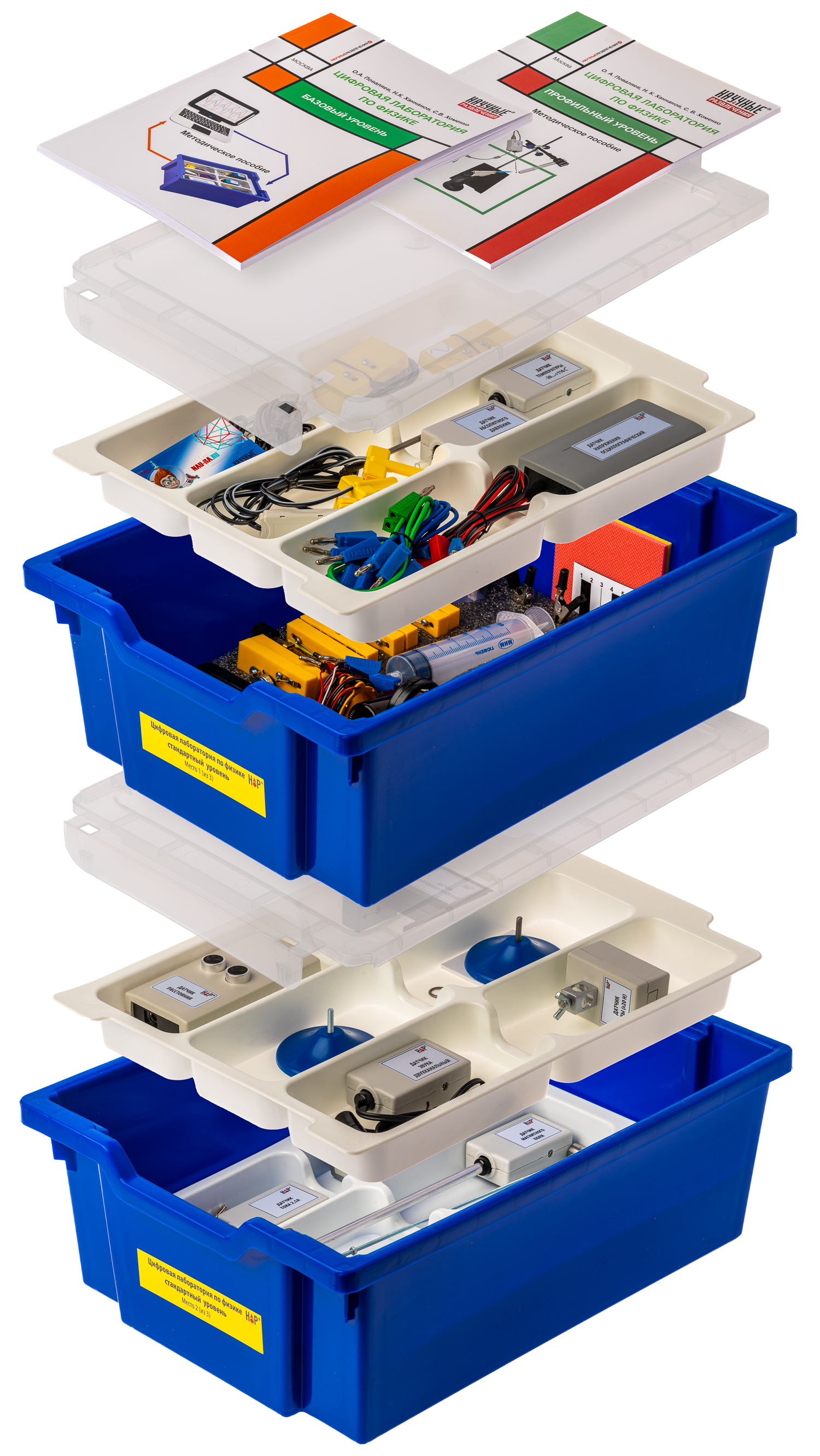 Все оборудование цифровой лаборатории (кроме скамьи лабораторной) укомплектовано в системы хранения, которые закрываются прозрачной пластиковой крышкой на защелках для обеспечения наблюдения за содержимым. Комплект оборудования и датчики в системе хранения располагаются на ложементах в индивидуальных ячейках.