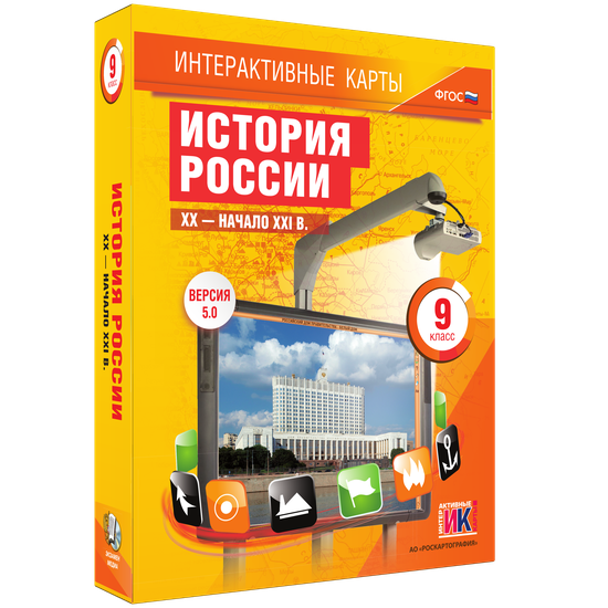 Материал интерактивного учебного пособия «Интерактивные карты по истории. История России. XX – начало XXI в. 9 класс» содержит учебные карты по всем темам курса истории России 9-го класса.