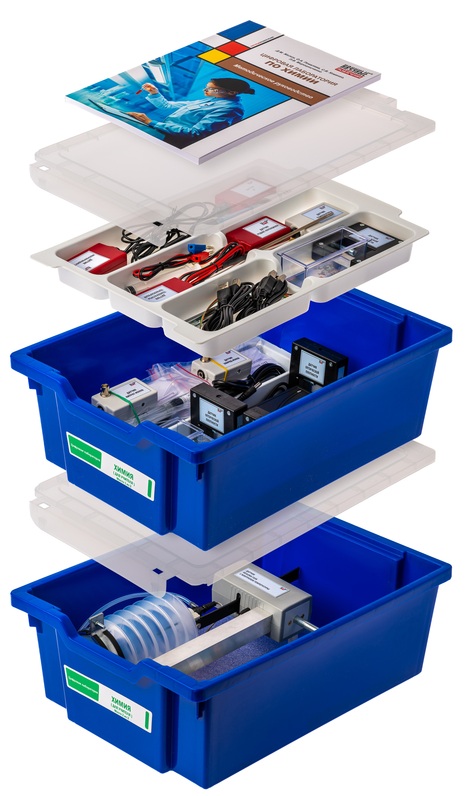 Цифровая лаборатория укомплектована в пластиковую систему хранения, которая закрывается прозрачной пластиковой крышкой на защелках для обеспечения наблюдения за содержимым. Комплект оборудования и датчики в системе хранения располагаются на ложементах.