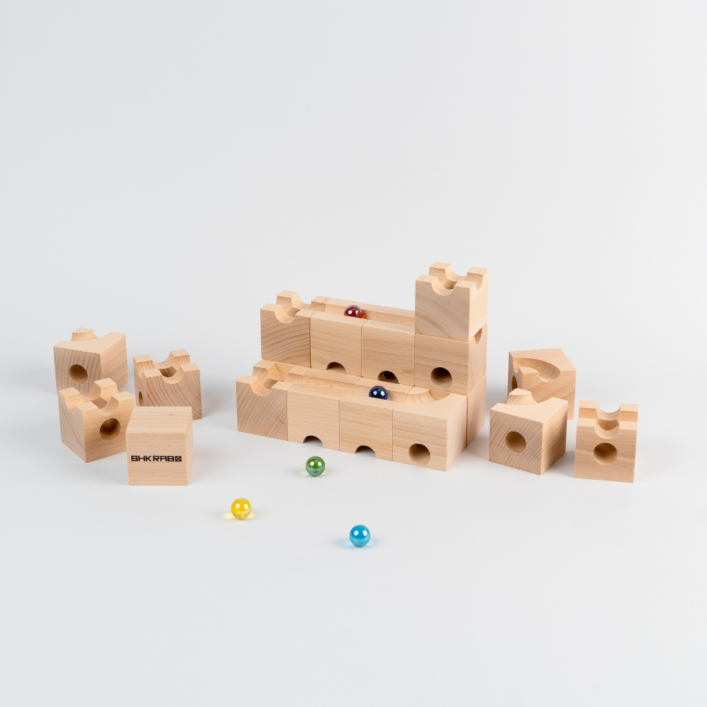 Состав: 30 деревянных кубиков, размер 50*50*50мм. 5 стеклянных шариков диаметр 17мм. Материал: бук.