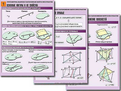 Комплект учебно-наглядных пособий формата А1 с полноцветной двухсторонней печатью и матовой двухсторонней ламинацией в количестве 8 таблиц: 1. Основные фигуры и их свойства. 2. Взаимное расположение прямых в пространстве. 3. Скрещивающиеся прямые. 4. Взаимное расположение прямой и плоскости. 5. Перпендикулярность прямых и плоскостей. 6. Параллельность прямых и плоскостей. 7. Взаимное расположение плоскостей. 8. Теорема о трех перпендикулярах.