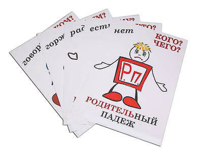 Пособие состоит из 6 полноцветных таблиц формата А3, ламинированных матовой пленкой. На таблицах даны графические изображения шести падежей в виде человечков, которые демонстрируют смысл вспомогательного слова, названия падежей, вспомогательные слова и соответствующие вопросы.